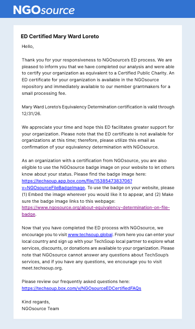 Mary Ward Loreto is proud to announce that we have successfully completed the Equivalency Determination (ED) process with NGOsource and have been certified as equivalent to a Certified Public Charity.